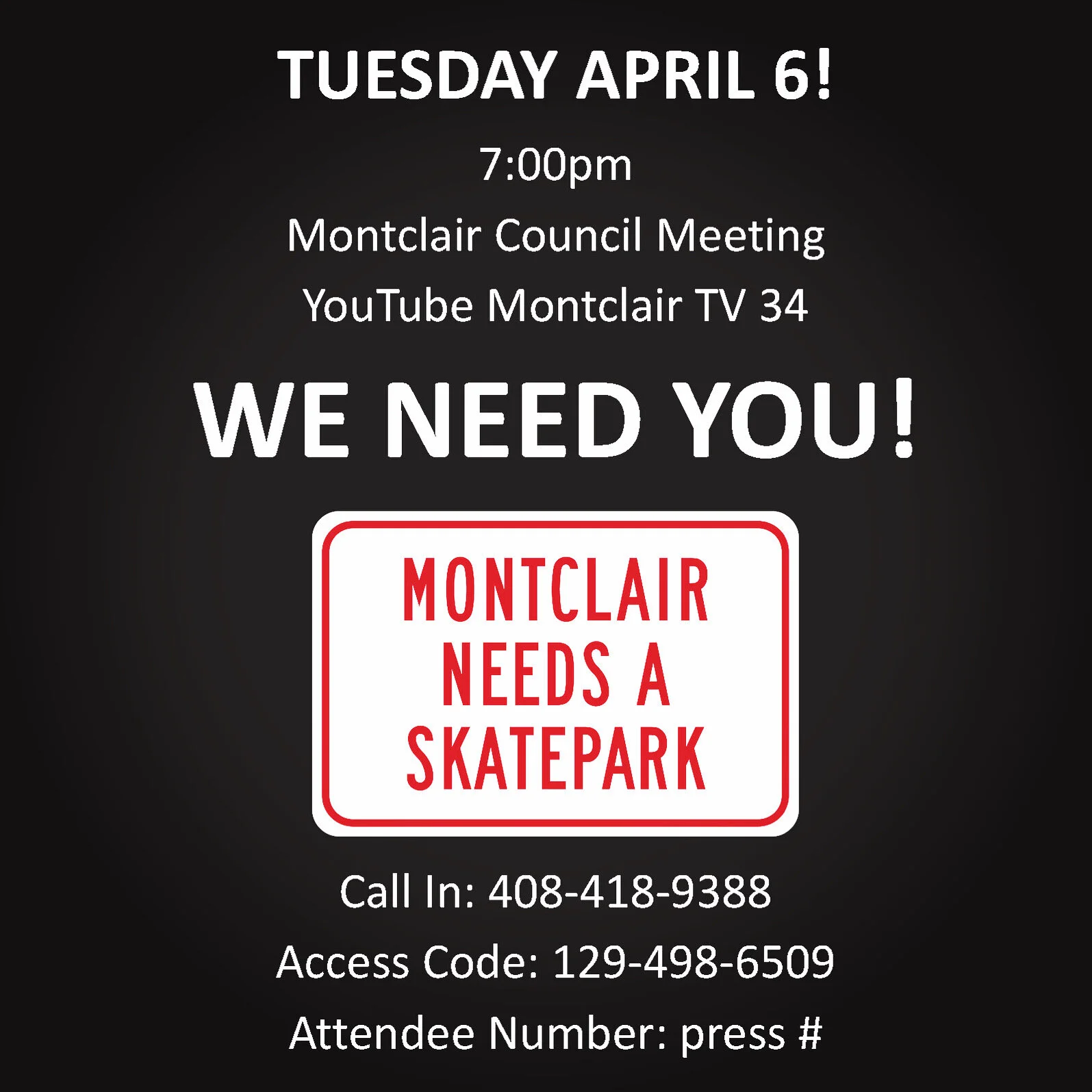 Call into Montclair Town Council Meeting to voice your support for a permanent skatepark! WE NEED YOU!
